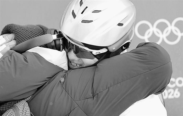 2月20日,王心迪(右)和妻子徐梦桃在比赛中拥抱。当地时间2月20日,在意大利利维尼奥举行的米兰-科尔蒂纳冬奥会自由式滑雪男子空中技巧决赛中,中国选手王心迪和李天马分获冠军和季军。 新华社记者 邬惠我 摄