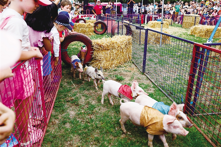 2月22日,在澳大利亚堪培拉举行的“皇家堪培拉秀”农展会上,人们观看参加活动的宠物猪。 新华社发(储晨 摄)