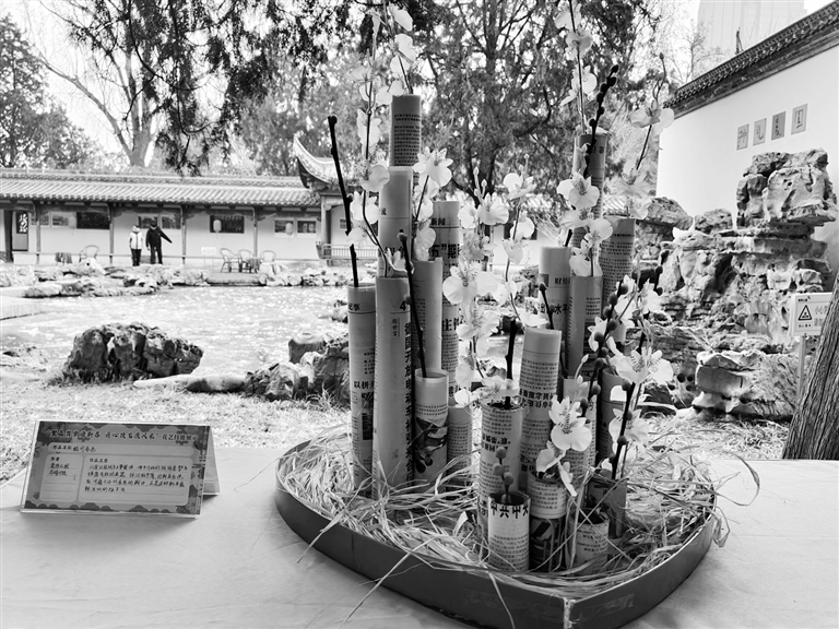 在竞秀公园,“竞秀迎春,繁花贺岁”的雅致气息扑面而来。竞秀书院的园林插花创意展现场,园艺师们将园内收集的枯枝、松果、旧竹巧妙组合,寻常废弃物在他们手中化为《雀舞春风 鸿运当头》《紫气东来迎新春》《纸间春色》等充满巧思的艺术盆景,引来游客阵阵赞叹。一旁的“迎新春,送祝福”党日活动也暖意融融,书法爱好者挥毫泼墨,一副副红火的春联和饱满的“福”字被递到市民手中,笑意在彼此间传递。自然学堂内,“匠心花艺”体验活动则让市民亲手触摸春意,在园艺师的指导下创作属于自己的插花作品。