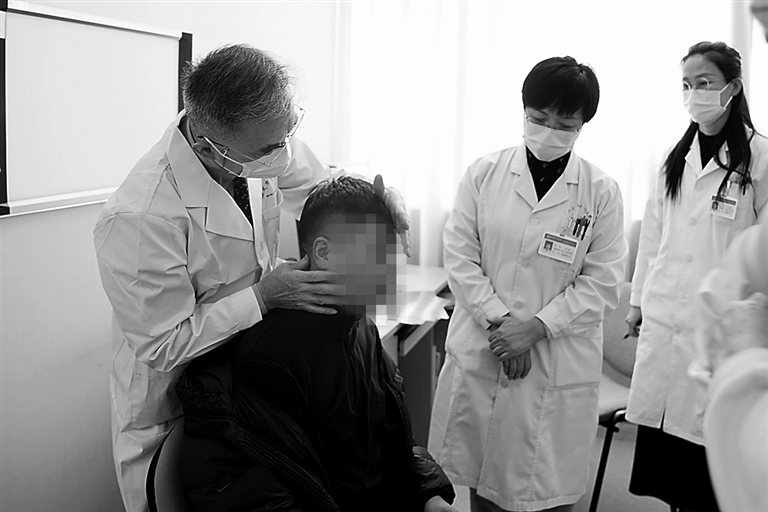 中日友好医院李石良教授在为患者检查身体。