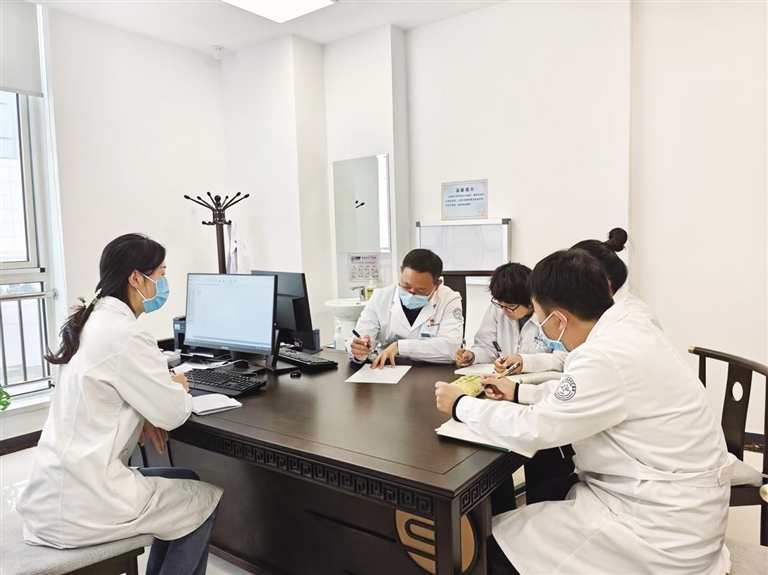 ④马继征(左二)与医生讨论医疗方案。 广安门医院保定医院供图