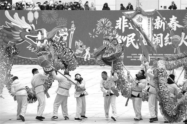 2月28日,观众在观看来自河北的曲周龙灯展演。当日,中国工艺美术馆(中国非物质文化遗产馆)和中国共产党历史展览馆共同举办“非遗贺新春 民俗闹红火”活动,来自北京、陕西、山西等8个省区市的民俗展演团队,为观众奉上曾庄大鼓、麒麟舞、寿阳高跷竹马戏、蒙古族马头琴音乐等14项民俗展演。 新华社记者 鞠焕宗 摄