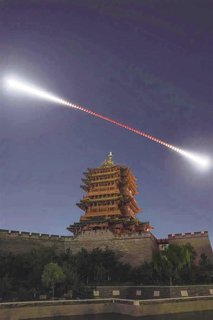 2025年9月7日夜晚至8日凌晨,在山西大同古城墙乾楼拍摄的月全食轨迹(多张堆栈),形似“金箍棒”。 新华社发(韩享 摄)