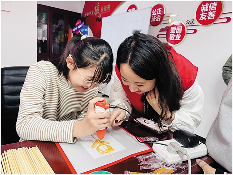 志愿者指导社区青少年感受非遗糖画魅力。 刘迪 摄