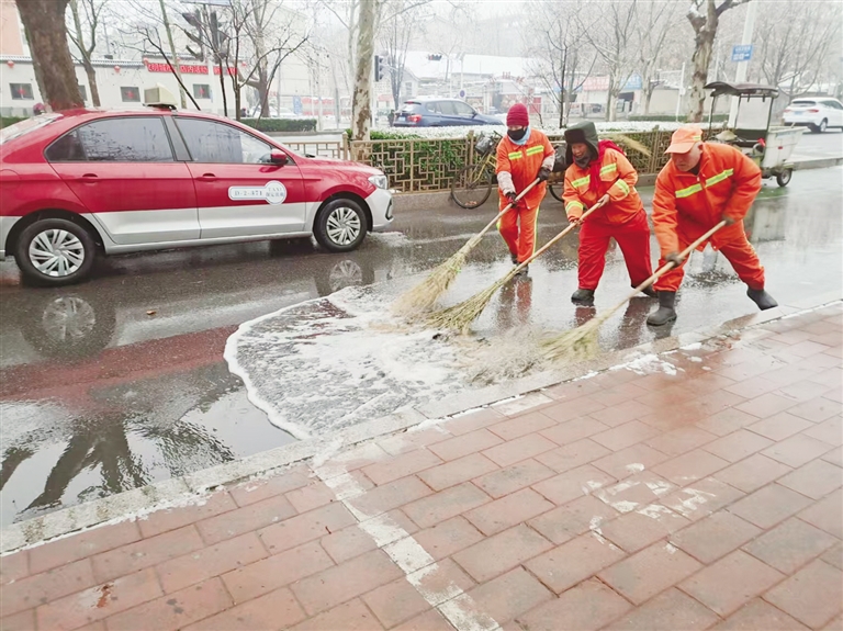 主城区环卫工人全员到岗,清扫路面积雪。