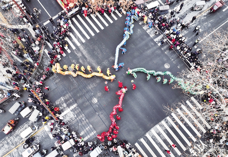 ◀3月2日,游客在河南省济源市济水街道观看舞龙表演。 新华社发(苗秋闹 摄)