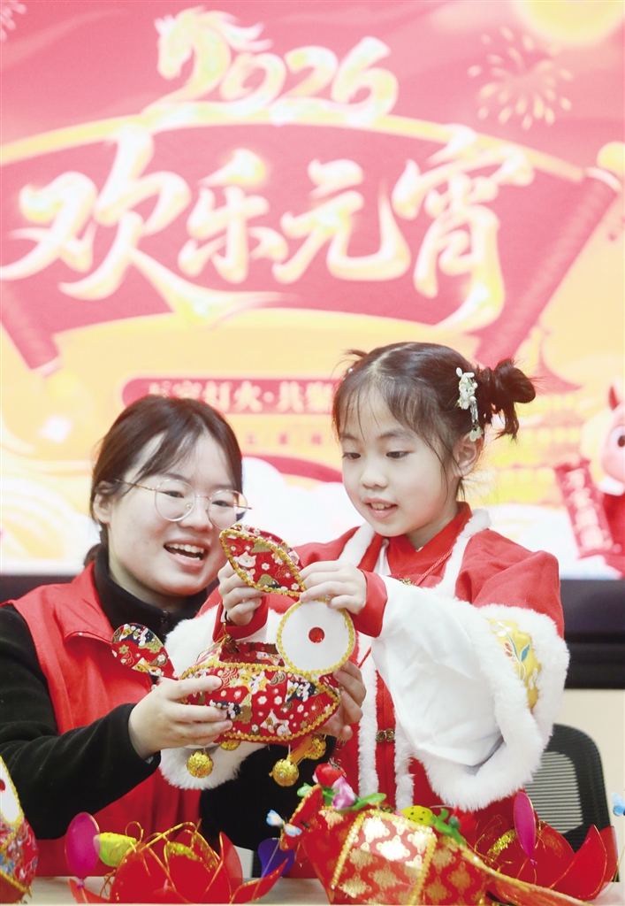 ◀3月2日,在江苏省扬州市徐凝门街社区,志愿者指导小朋友制作花灯。 新华社发(孟德龙 摄)